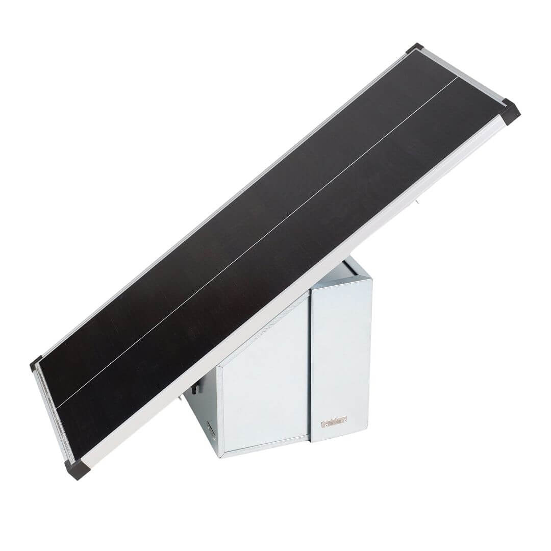Držiak na montáž solárneho panela fencee s výkonom 100 W. Držiak s namontovaným solárnym panelom sa priskrutkuje k bezpečnostnej skrinke na napájanie fencee a k batérii. Možno ho priskrutkovať aj k držiaku s vrutom do zeme.