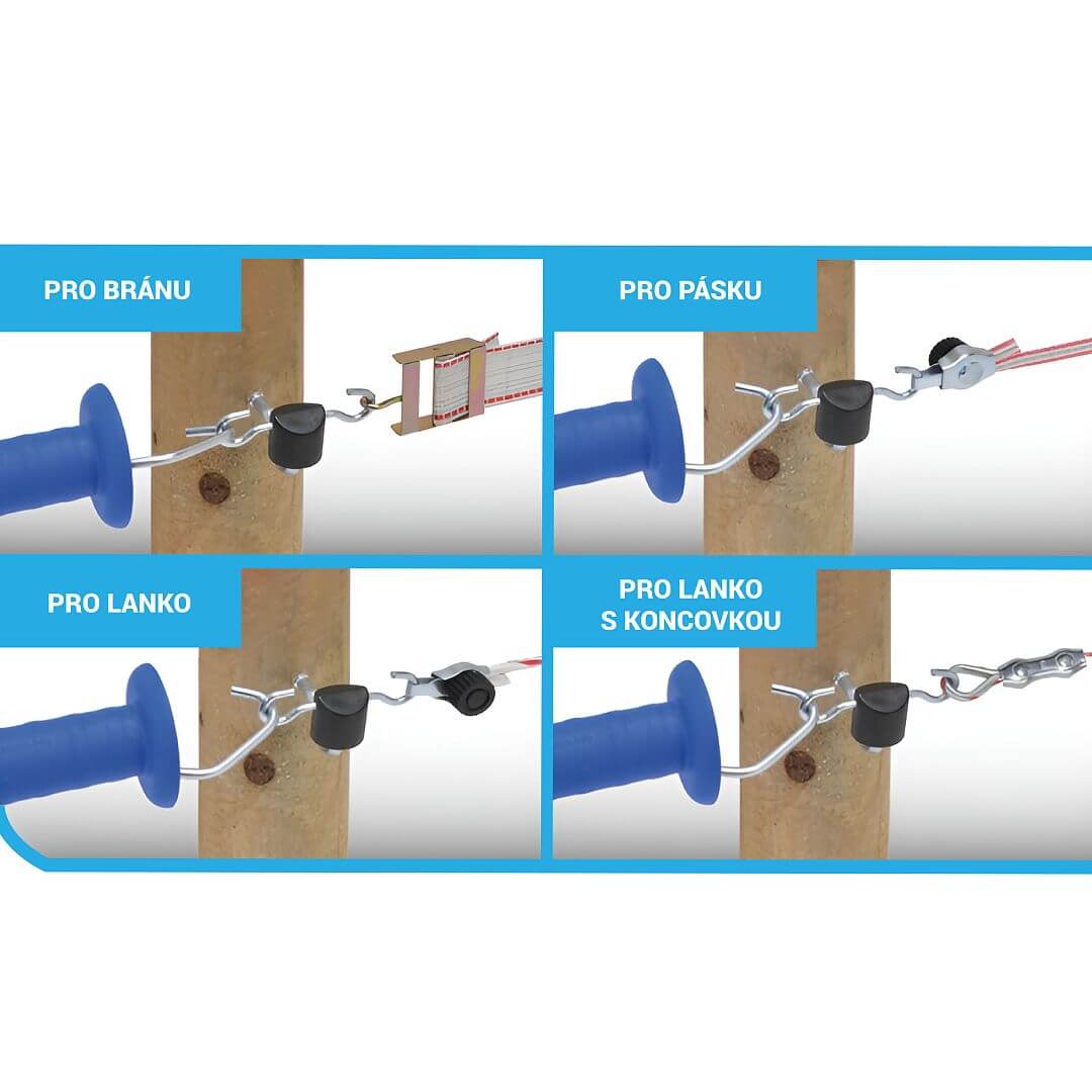 Izolátor brány so zakrivenou podperou a dvoma hákmi pre elektrický ohradník.