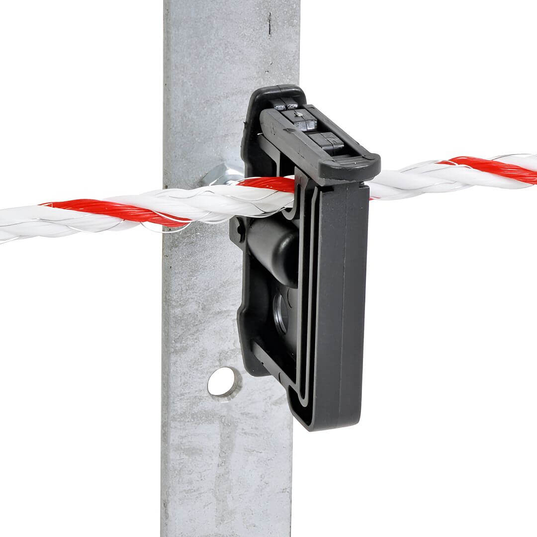 Veľký izolátor s veľmi dobrou izoláciou. Zárez na lano elektrického ohradníka do Ø 6 mm. Izolátor vhodný na upevnenie na kovové stĺpiky.