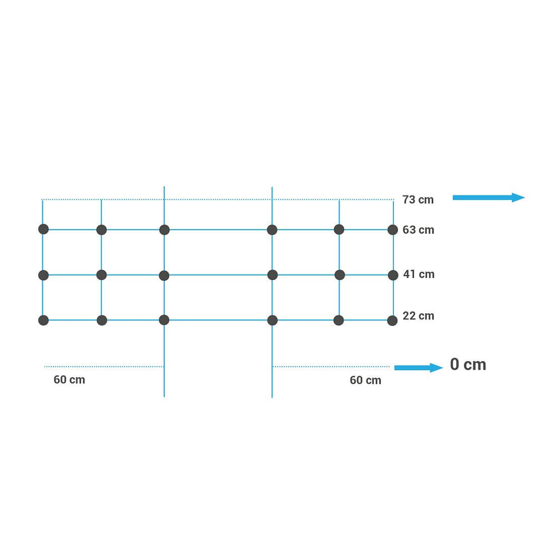 12 stabilných modrých stĺpikov zo sklených vlákien vzdialených od seba približne 4,5 m