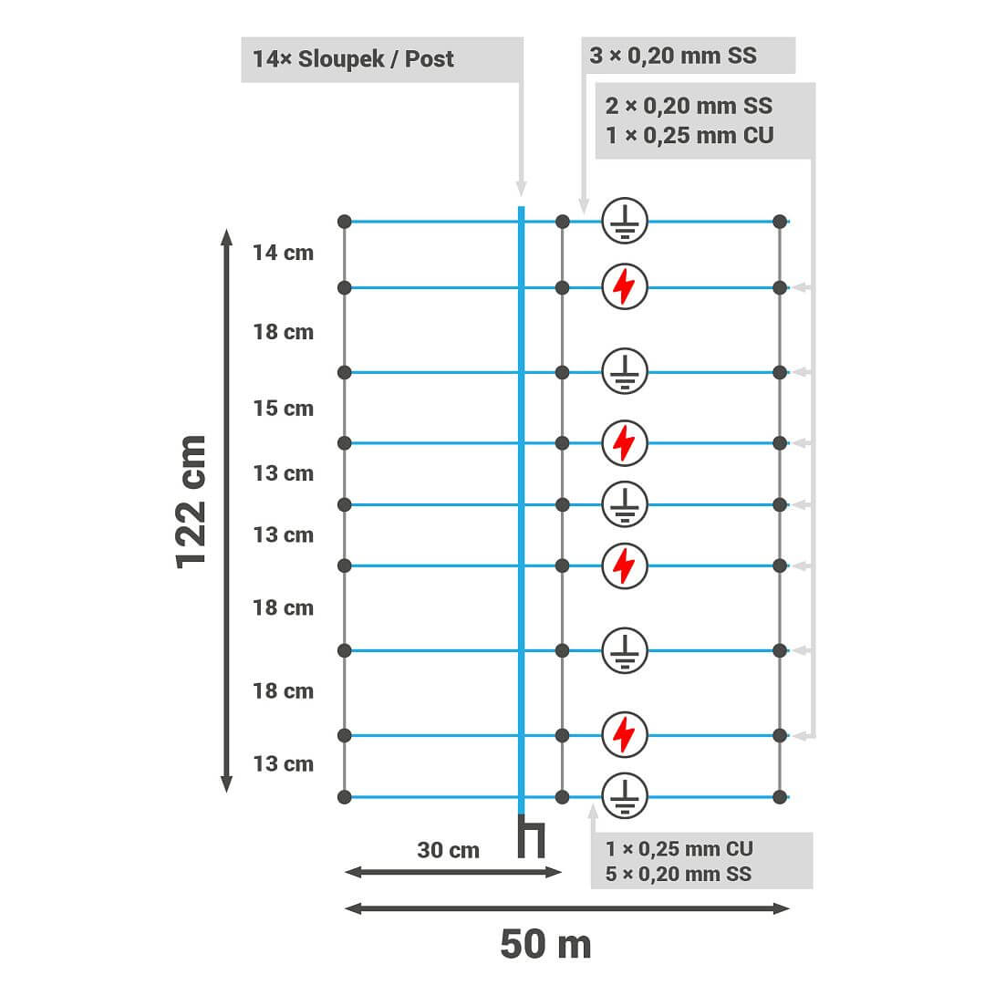 Špeciálna modrá sieť proti vlkom pre elektrický ohradník pre ovce. Vo vertikálnom smere sa namiesto mäkkého drôtu používajú pevné plastové vzpery. Tie sú pevne spojené s vodorovnými prameňmi vo vzdialenosti 30 cm, a tak zabezpečujú výnimočnú stabilitu aj v kopcovitom a nerovnom teréne.