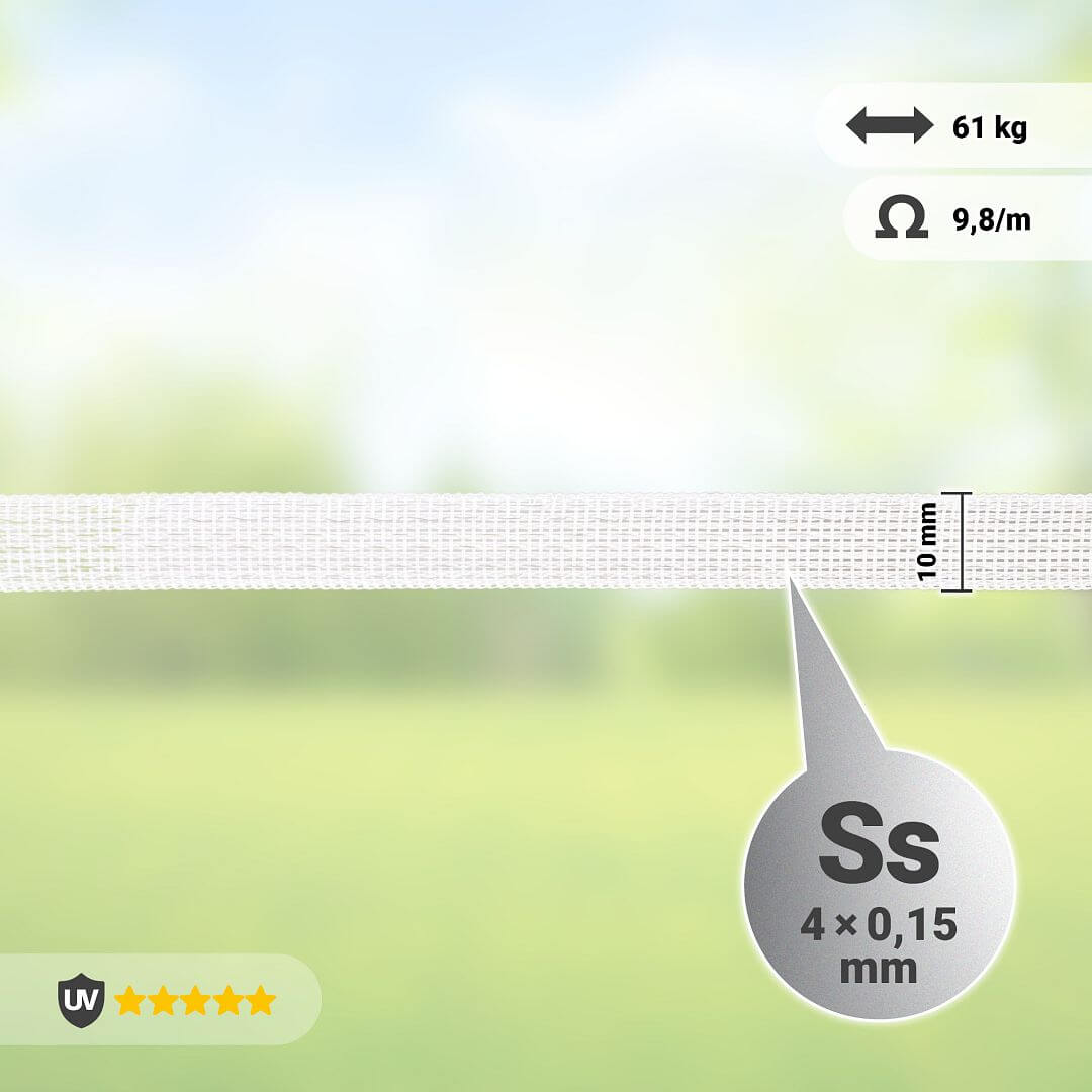Ľahká biela páska na elektrický ohradník so šírkou 10 cm. Dĺžka kotúča 200 m. Štyri drôty z nehrdzavejúcej ocele vo vnútri. Vhodná na krátke a stredne dlhé ploty. Odpor 9,8 Ω/m.