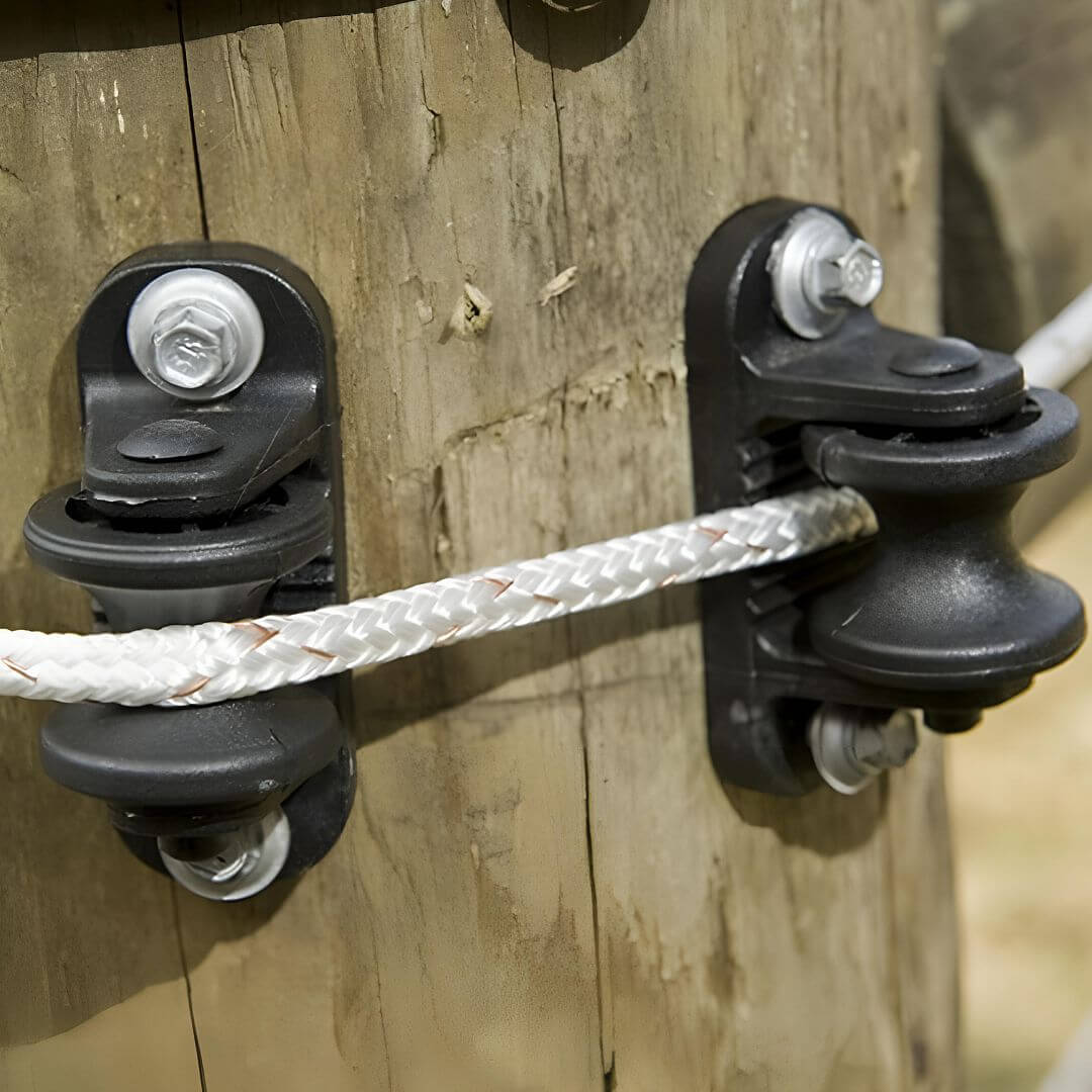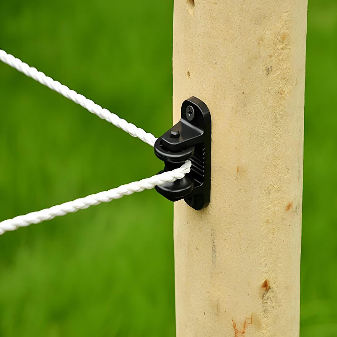 Rohový plne otočný izolátor pre elektrický ohradník s odnímateľným plastovým valčekom.