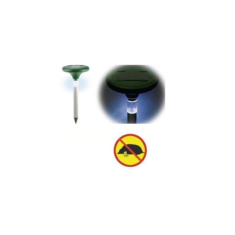 Solárny ultrazvukový odpudzovač krtkov s účinnosť až 800 m², solárny článok 90 x 70 mm, vyžarovanie vĺn v 50s intervaloch, frekvencia 400 – 100 Hz, vstavaný solárny článok a nabíjačka batérií, vymeniteľná NI-MH batéria 1,2V / 300mAh, materiál výroby plast / hliníková tyč