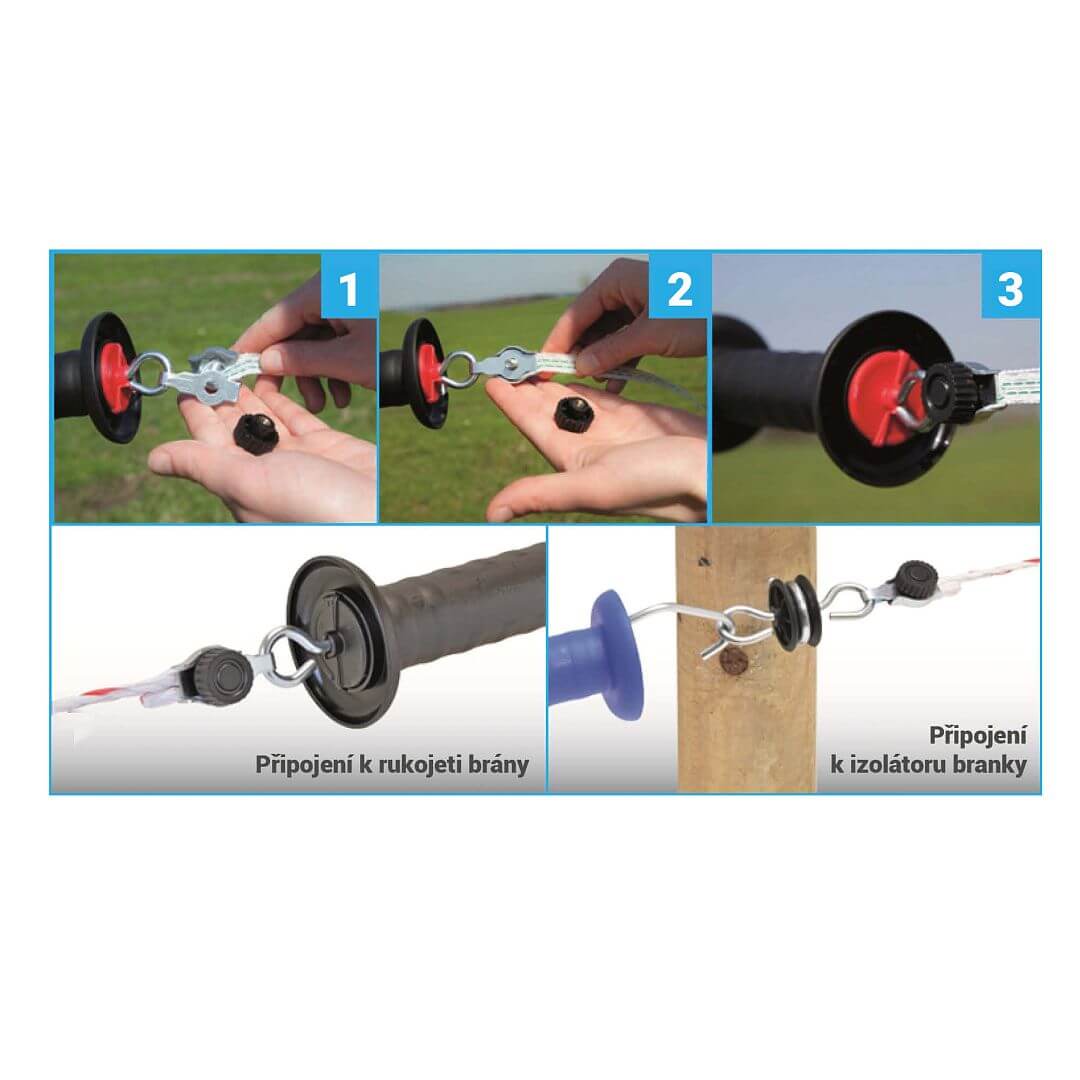 Spojka umožňuje jednoduché pripojenie drôtu k rukovätiam, držadlám brány a izolátorom brány.