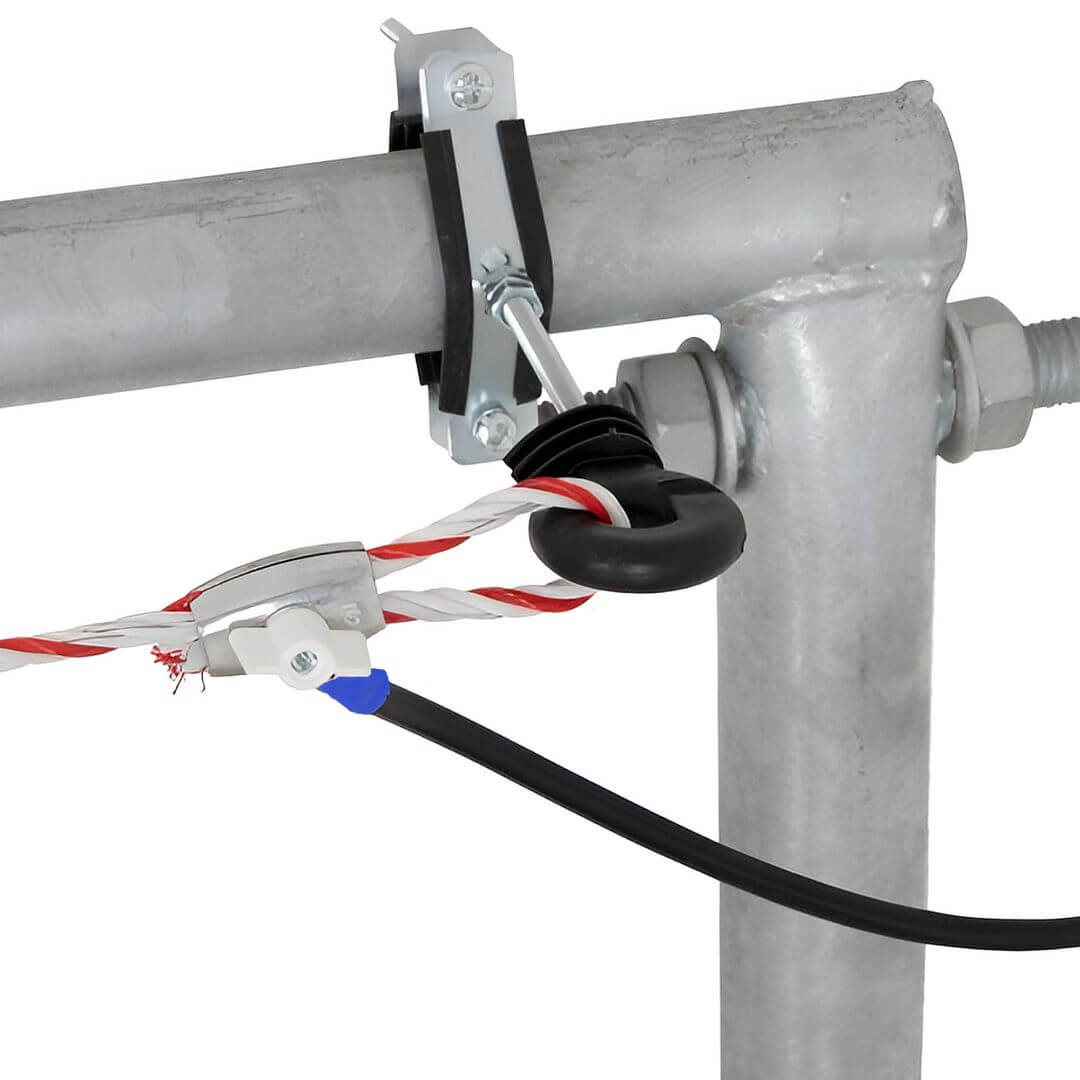 Praktická súprava na elektrifikáciu štandardnej kovovej brány pre elektrický plot. Umožňuje vedenie drôtu okolo brány elektrického ohradníka. Obsahuje zásuvky so závitom M6, vysokonapäťový izolovaný pripojovací kábel, lano ø 6 mm a plotové spojky.